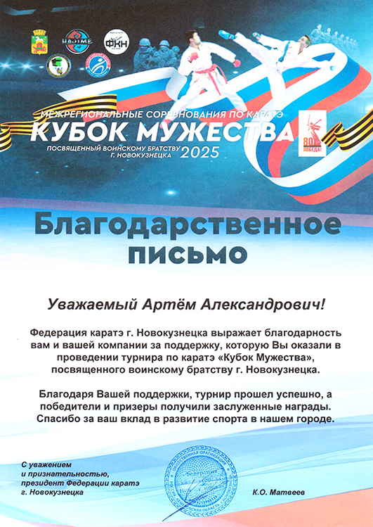 В 8-9 февраля 2025 года Федерацией каратэ г.Новокузнецка были проведены уже традиционные соревнования "Кубок мужества 2025". Партнер центр совместно с АК Стимул оказали материальную поддержку в организации и проведении соревнований. К вершинам победы - вместе!